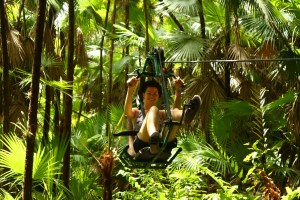 And then there was the jungle adventure. I rode the Skycycle, essentially a recumbent bike hanging from a zipline. I was comfortable doing that because it was slow and I could control the speed. Being suspended from a cable didn’t bother me and I was able to gaze out into the lushest, densest vegetation I have ever seen, as well as pedal into a cenote, suspended only inches over water and only inches under flitting bats.